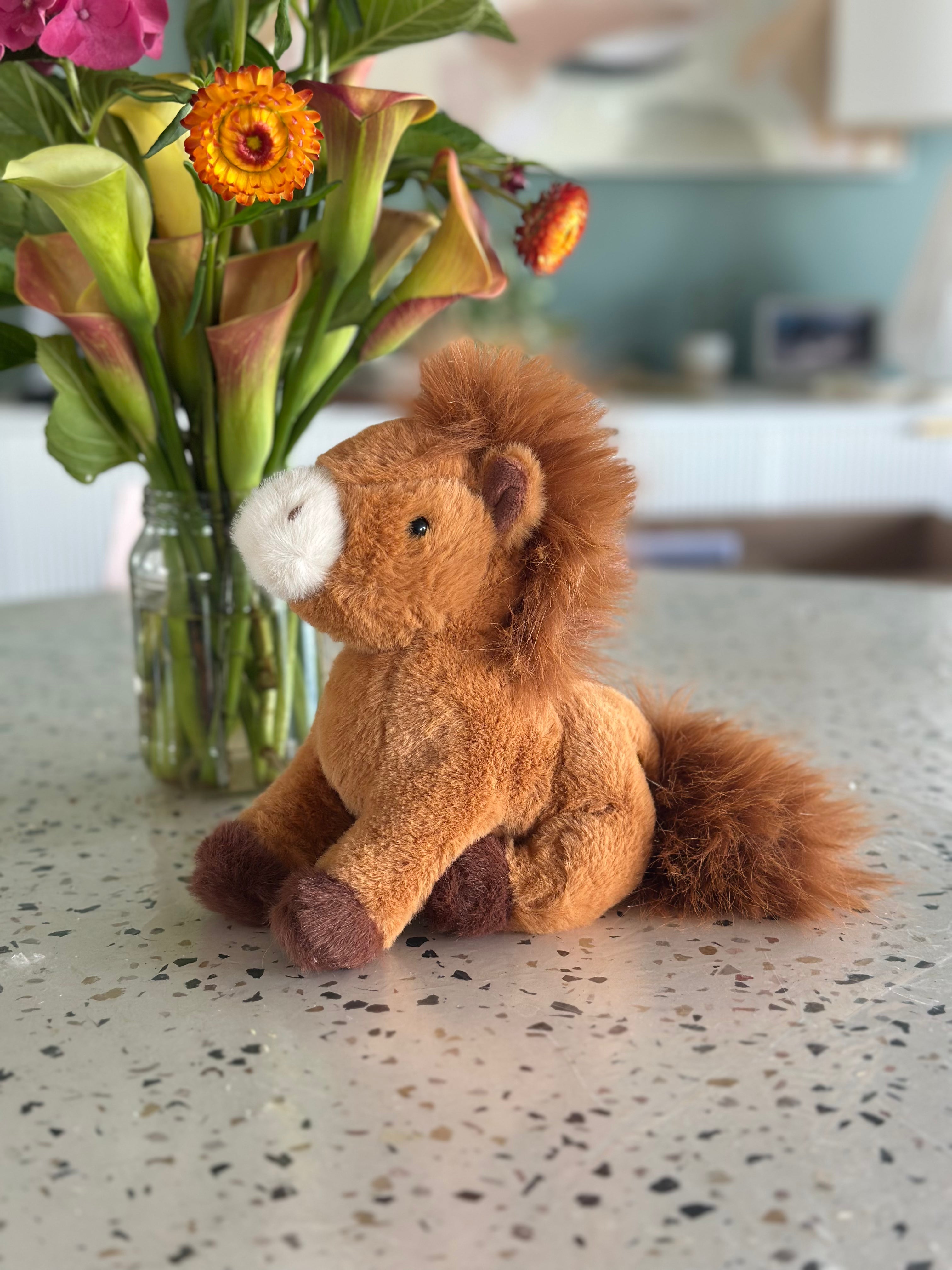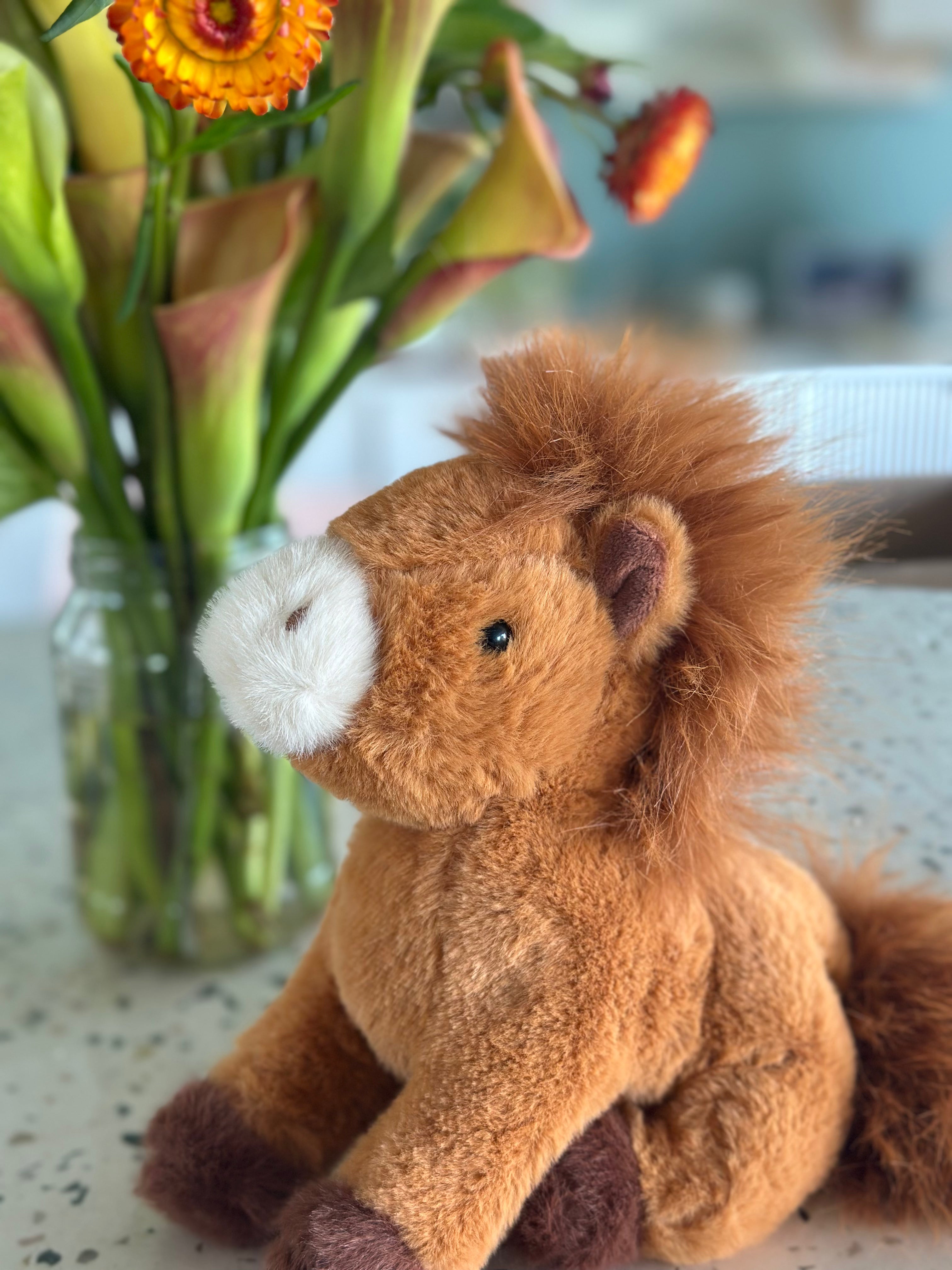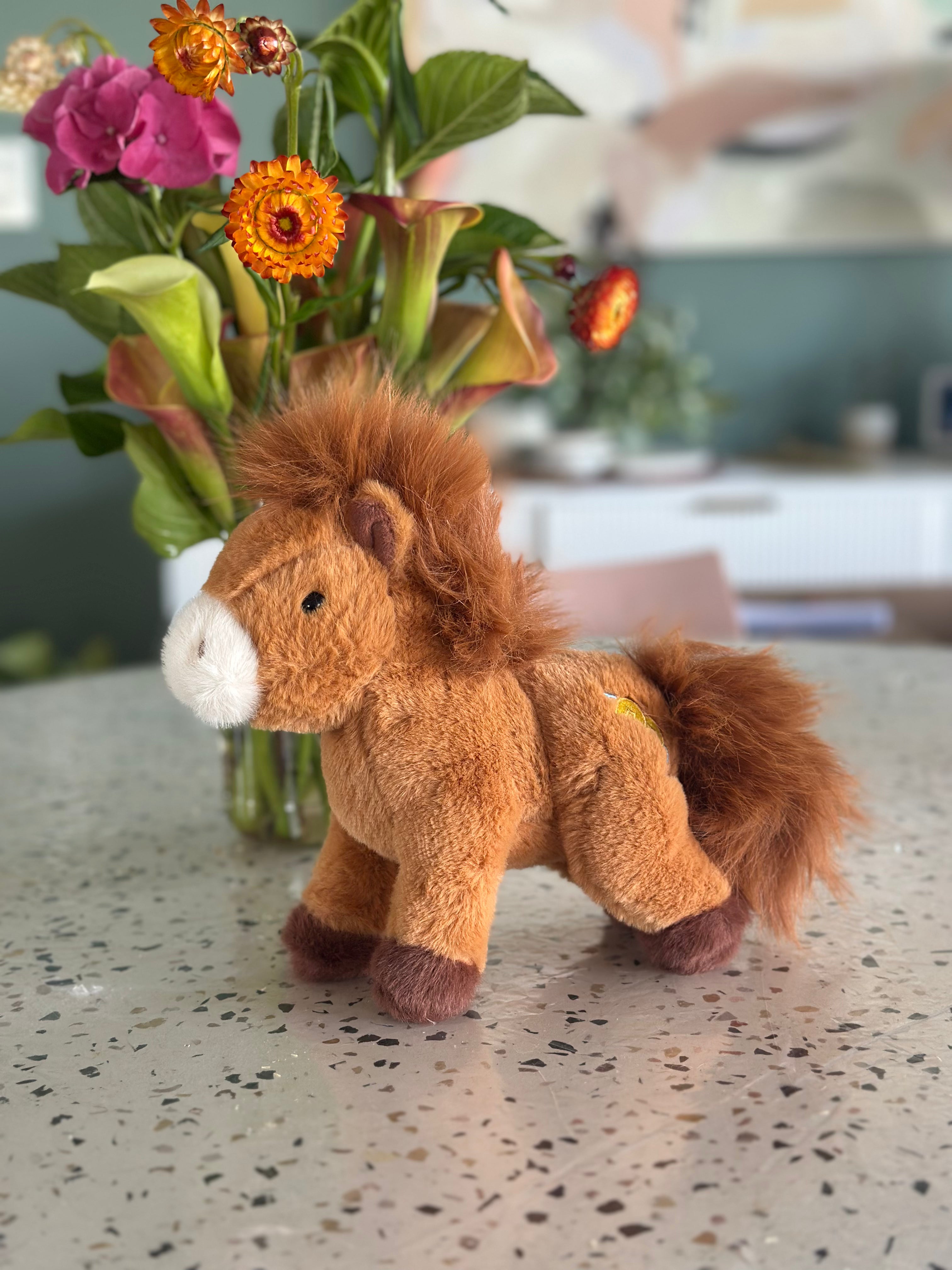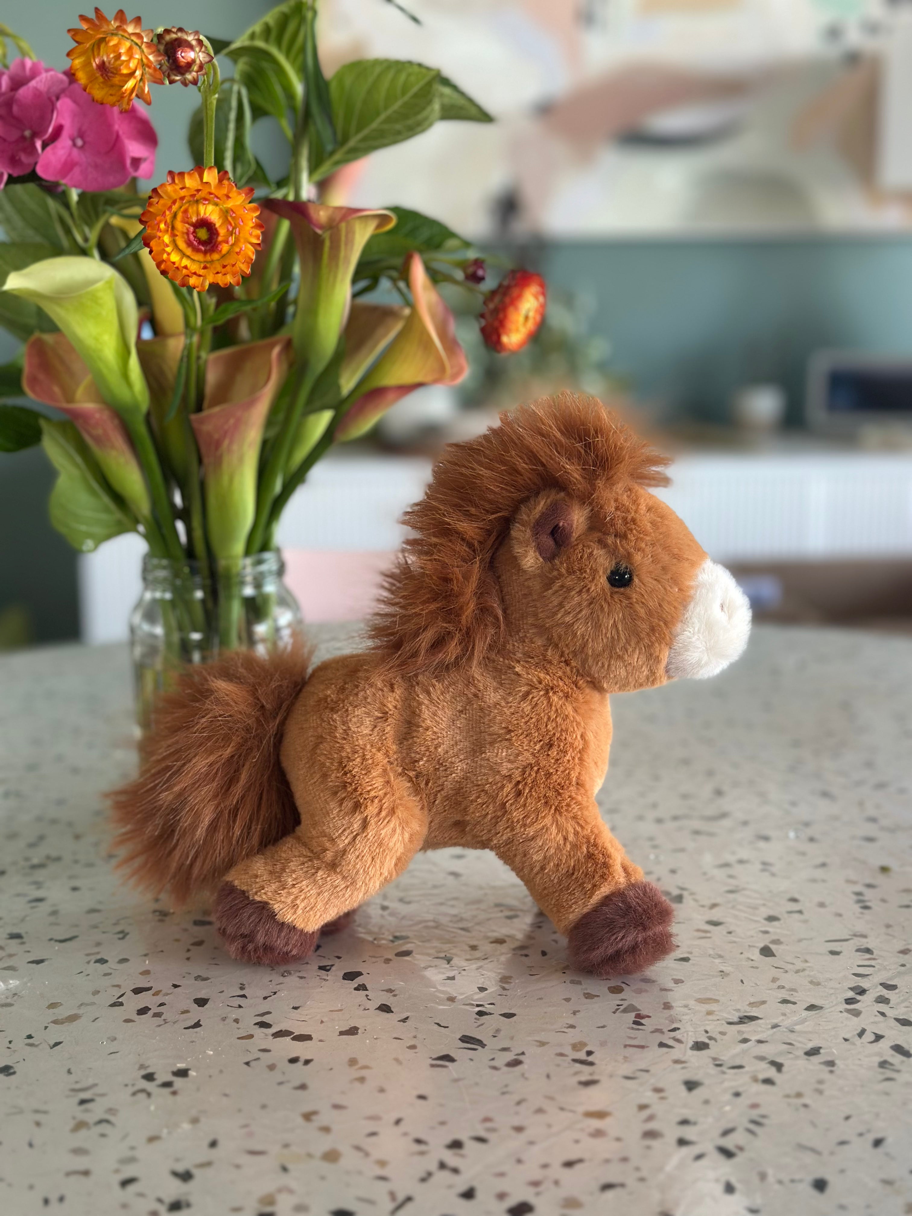 C4C soft toy – ultra soft plushie with some weight to it – has beanies in his torso. Can sit and stand. Super cute! Brown with brown mane, tail and white nose with darker brown feet.