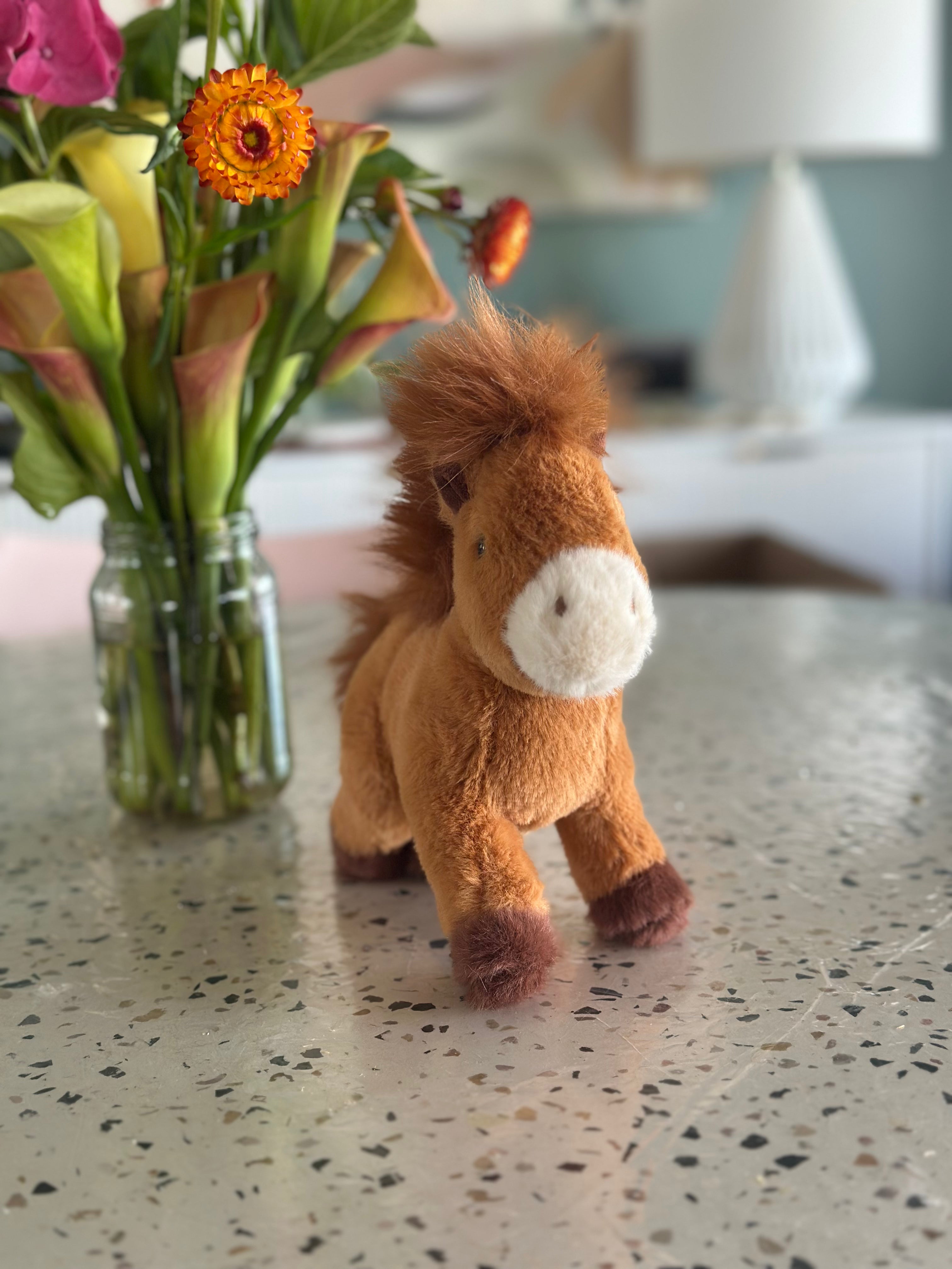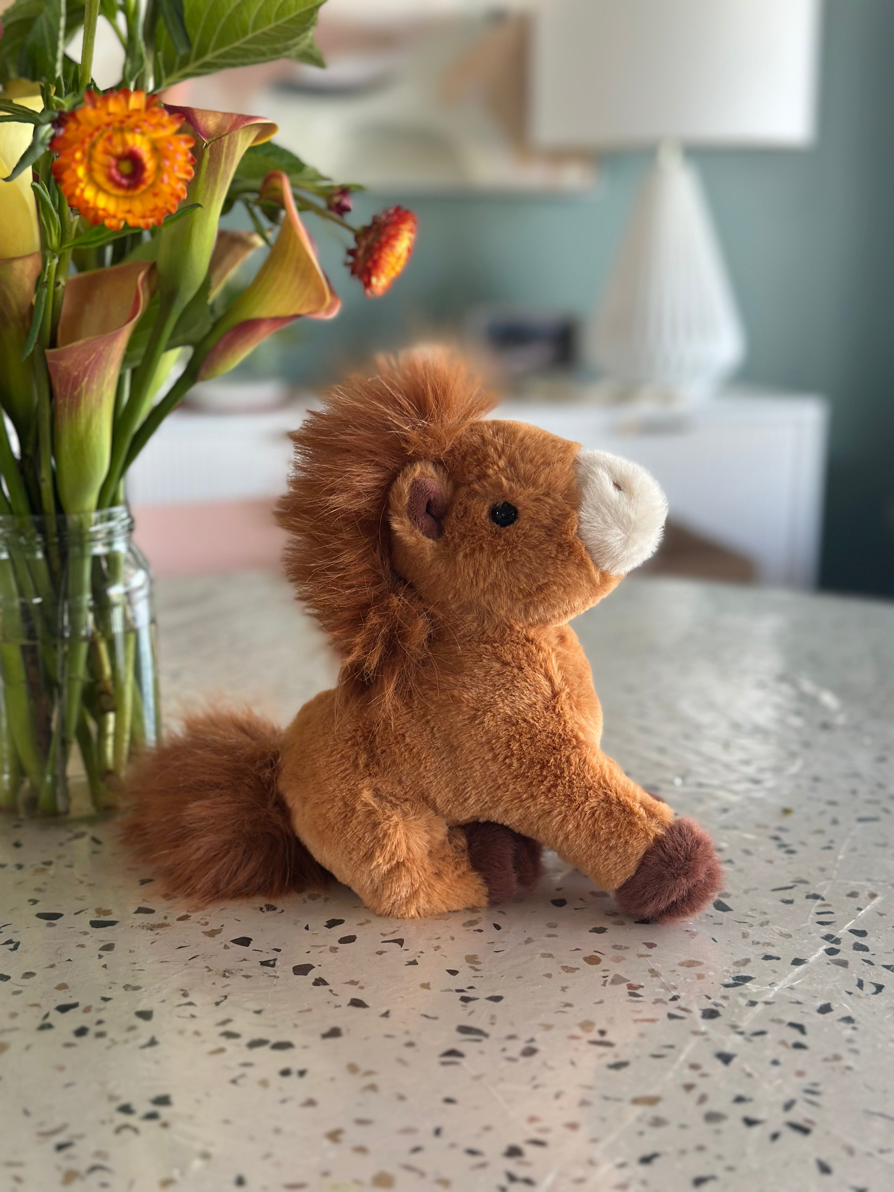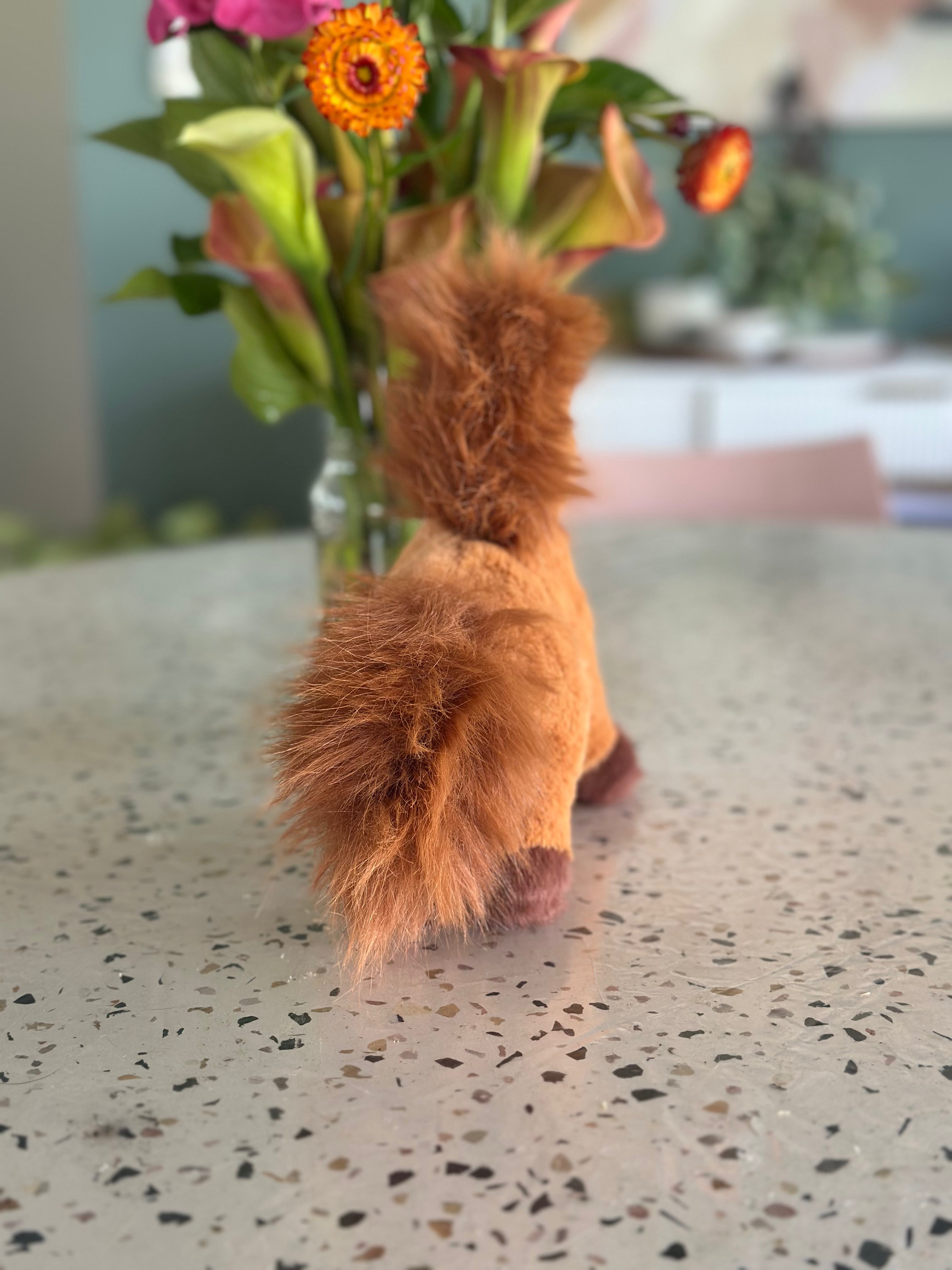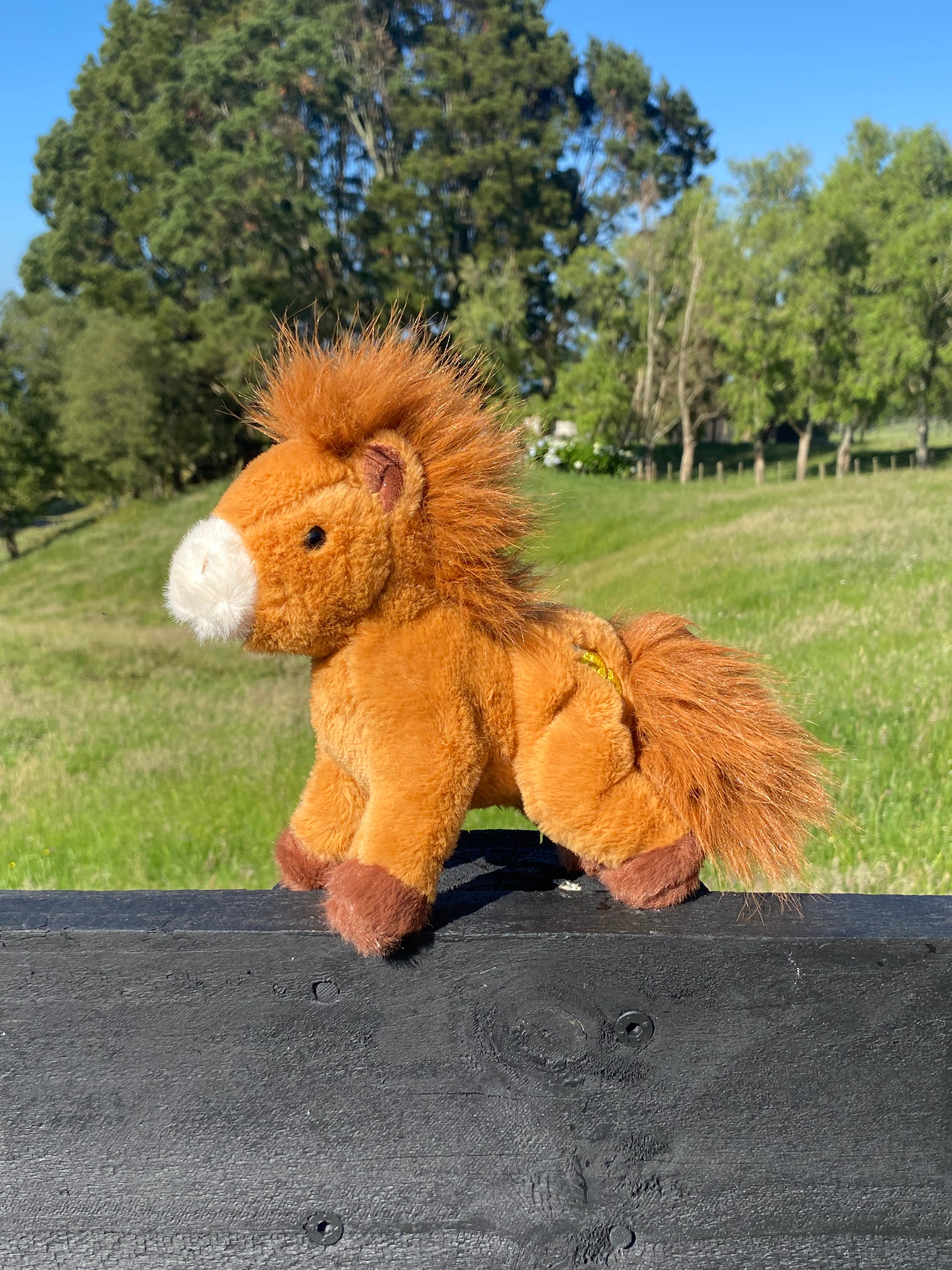 C4C soft toy – ultra soft plushie with some weight to it – has beanies in his torso. Can sit and stand. Super cute! Brown with brown mane, tail and white nose with darker brown feet.